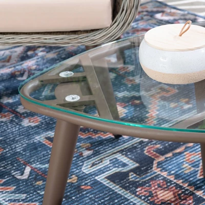 Welcome sunny days to your pool house, beach patio, city rooftop or rural porch with this refined 3-piece set. Features are matching chairs with all-weather wicker, plush foam cushions covered in beige outdoor fabric and a triangular glass table that offers a perch for drinks and appetizer plates. Each piece is supported by brown metal legs and equipped with plastic feet for stability and protection against floor scratches. Weather resistant and ready for Mother Nature’s whims, this ensemble is sure to liven things up this season and many thereafter.