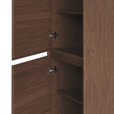This 2-door midcentury modern bookcase offers adequate storage without any frills or distractions. Constructed of warm walnut stained solid Brazilian jequitiba wood for strength, durability and a beautiful woodgrain, the design leans into simple lines and a minimalist aesthetic. The large doors swing open to reveal 4 adjustable shelves that support up to 22 lbs. Whether you’re arranging your library, storing linens or organizing electronics, this piece offers inconspicuous storage. It brings a buttoned-up look to your home office, living room, dining room or bedroom.