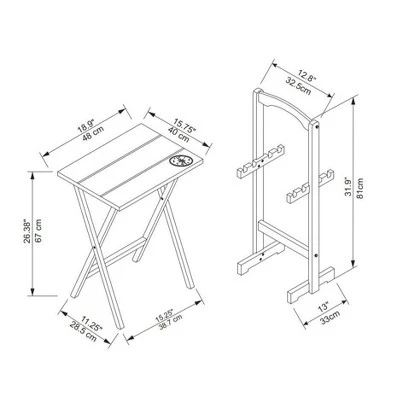 The TV Tray Table Set has a distinctive look with its sturdy wood construction and planked top. The compass designed top adds modern appeal to the set, which includes four foldable TV trays and one storage stand. The handle on the top of the stand makes it easy to transport the entire set from one room to another. A classic home furnishings staple.