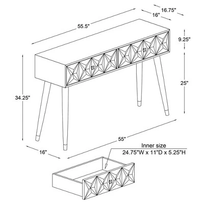 Make a bold statement with this stunning Hollywood glam style console table. A perfect fit for any entryway or hallway, this bright white finish with gold hardware boasts an eye catching raised geometric design. Place behind your living room sofa and top with a lamp and decorative pieces or use as a bedroom vanity. Two spacious drawers provide ample storage to complement the 55-inch-long display space on top. From glam to contemporary, chic good looks and great functionality make this console table the perfect addition to your home decor.