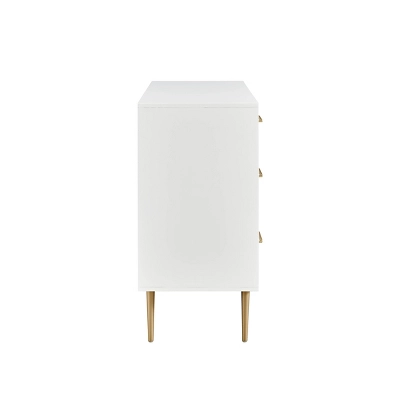 Glamorous to the eye and yet able to store a lot more than you would expect. Clean lines with slender accents of gold will finish off the design of your master bedroom or provide sophistication as a console or dining chest. With six drawers that glide open easily to store clothing, delicates, jewelry or whatever you need stored. Sleek sculpted gold drawer pulls, and legs add just the right touch.