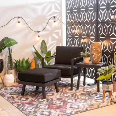 Sleek, comfortable, and well suited for the great outdoors, this modern chair is the perfect addition to your patio, porch, or rooftop. The black powder coated aluminum frame is resistant to rust and incredibly lightweight for ease of transport when you want to shimmy into the sun. Plus, there’s no need to worry about your cushions losing their color after only a few seasons, as the black Sunbrella™ fabric is fade, stain and mold resistant! Sit back and enjoy tomorrow’s style and comfort for years to come.