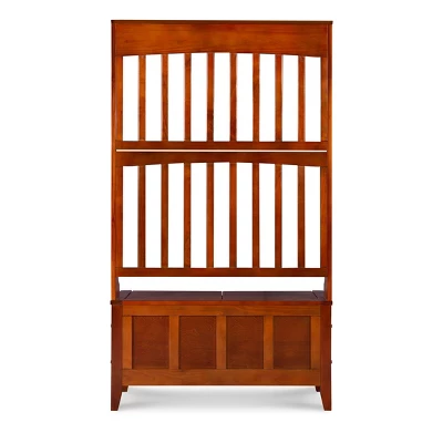 Keep your mud room or entryway neat and tidy with this beautiful and unique hall tree. Spacious seating area flips up to reveal a large storage section. The bench features a split seat, allowing the user to rest on one side of the bench, while retrieving articles from the storage compartment on the opposite side. A back panel with four hooks is perfect for hats and coats. Rich “walnut” finish will compliment virtually any decor. This hall tree will provide function and style to any room.