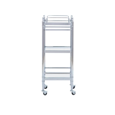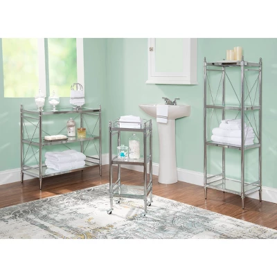Perfect for displaying and entertaining alike, this elegant Chrome and Glass Cart brings organized style to any room in your home. A chrome metal finish stylishly offsets 2 tempered glass shelves overtop a mirrored bottom shelf to create an overall chic look. Use the storage space to organize bathroom essentials in your master bathroom or place the cart beside a sofa for the perfect accent table in your living room.
