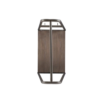 It’s time to do away with clutter and clothes draped over chairs and odd places! This minimal clothing rack provides an open canvas for your jackets, shirts, scarves and bags to hang front and center. Measuring at 25” L x 16” D x 60” H, this piece can make a big difference while taking up little floor space. The wooden bottom shelf in a distressed brown finish is perfect for storing folded laundry, shoes or bags, while 4 small hooks on both sides of the pewter metal frame offer extra hanging solutions. Easy assembly and confident style guaranteed.Overall Width: 25”Overall Depth: 15.75”Overall Height: 60”Shelf Width: 23”Shelf Depth: 15”Leg Height: 5.875”Shelf to Hook Height: 30.25”Top Width: 7.5”