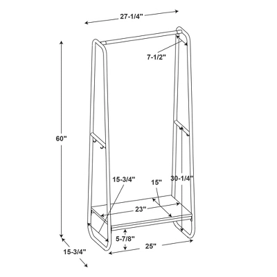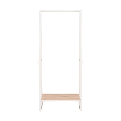 It’s time to do away with clutter and clothes draped over chairs and odd places! This minimal clothing rack provides an open canvas for your jackets, shirts, scarves, and bags to hang front and center. Measuring at 25” L x 16” D x 60” H, this piece can make a big difference while taking up little floor space. The wooden bottom shelf in a natural finish is perfect for storing folded laundry, shoes, or bags, while 4 small hooks on both sides of the white metal frame offer extra hanging solutions. Easy assembly and confident style guaranteed.Overall Width: 25”Overall Depth: 15.75”Overall Height: 60”Shelf Width: 23”Shelf Depth: 15”Leg Height: 5.875”Shelf to Hook Height: 30.25”Top Width: 7.5”