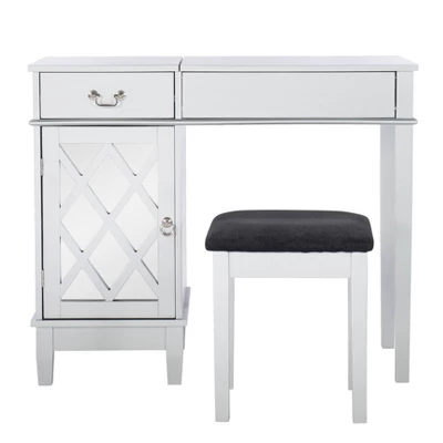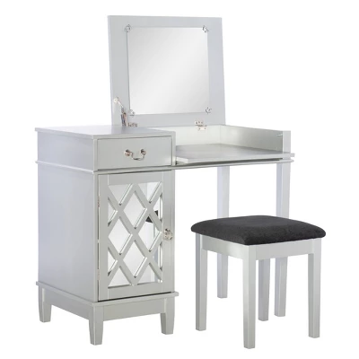 The Silver Lattice Vanity Set is ideal for any modern or contemporary styled bedroom. The spacious top has room for a variety of cosmetics, jewelry and other beauty supplies. Half of the top lifts to reveal a large mirror and open storage space. A single drawer has a silver decorative handle and opens to reveal additional storage. The left side of the vanity features a lattice designed mirrored door that opens to reveal a large storage space. Finished in a silver, the vanity is complemented by a thick padded stool with a black upholstered seat.