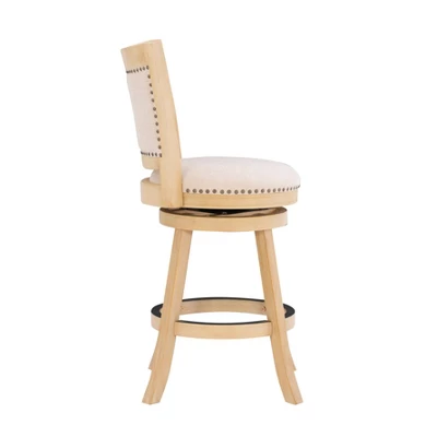 Add rustic style to your kitchen or dining space with the Tift Stool. Finished in a neutral gray wood, the stool has a padded back and seat. Antique brass nail heads give an extra detail to the stool. The swivel feature makes for easy transitions. Crafted from wood, the piece is sturdy and durable. Counter Height.